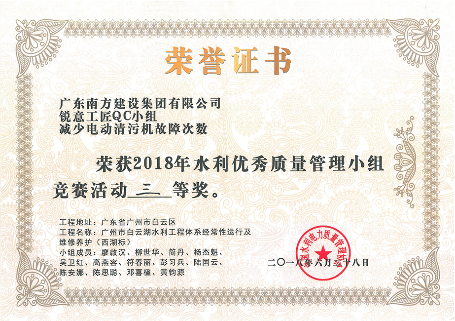 • 南方-2018年水利優(yōu)秀質量管理小組競賽活動三等獎