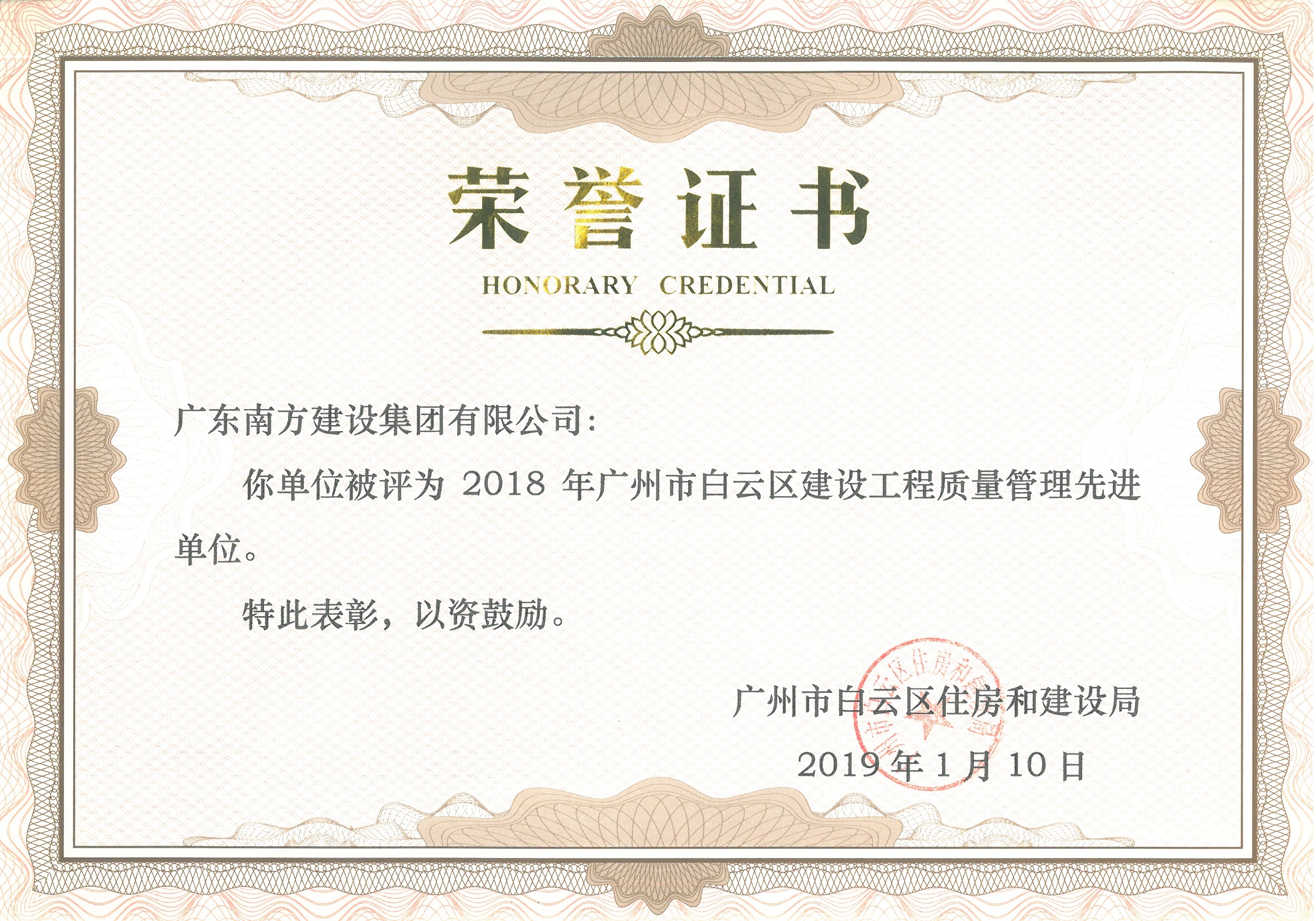 • 2018年廣州市白云區(qū)建設工程質量管理先進單位