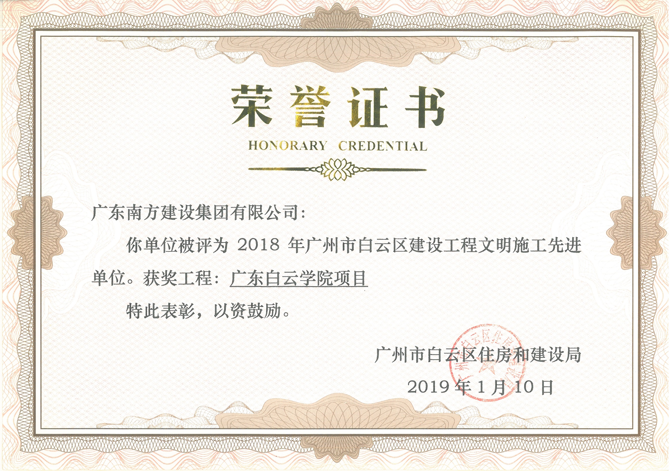 • 2018年廣州市白云區(qū)建設工程文明施工先進單位-廣東白云學院項目