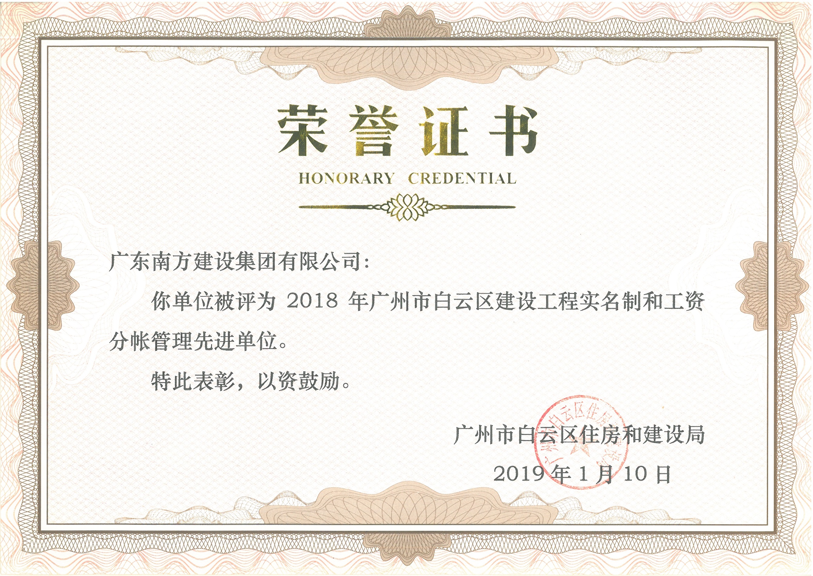 • 2018年廣州市白云區(qū)建設工程實名制和工資分帳管理先進單位