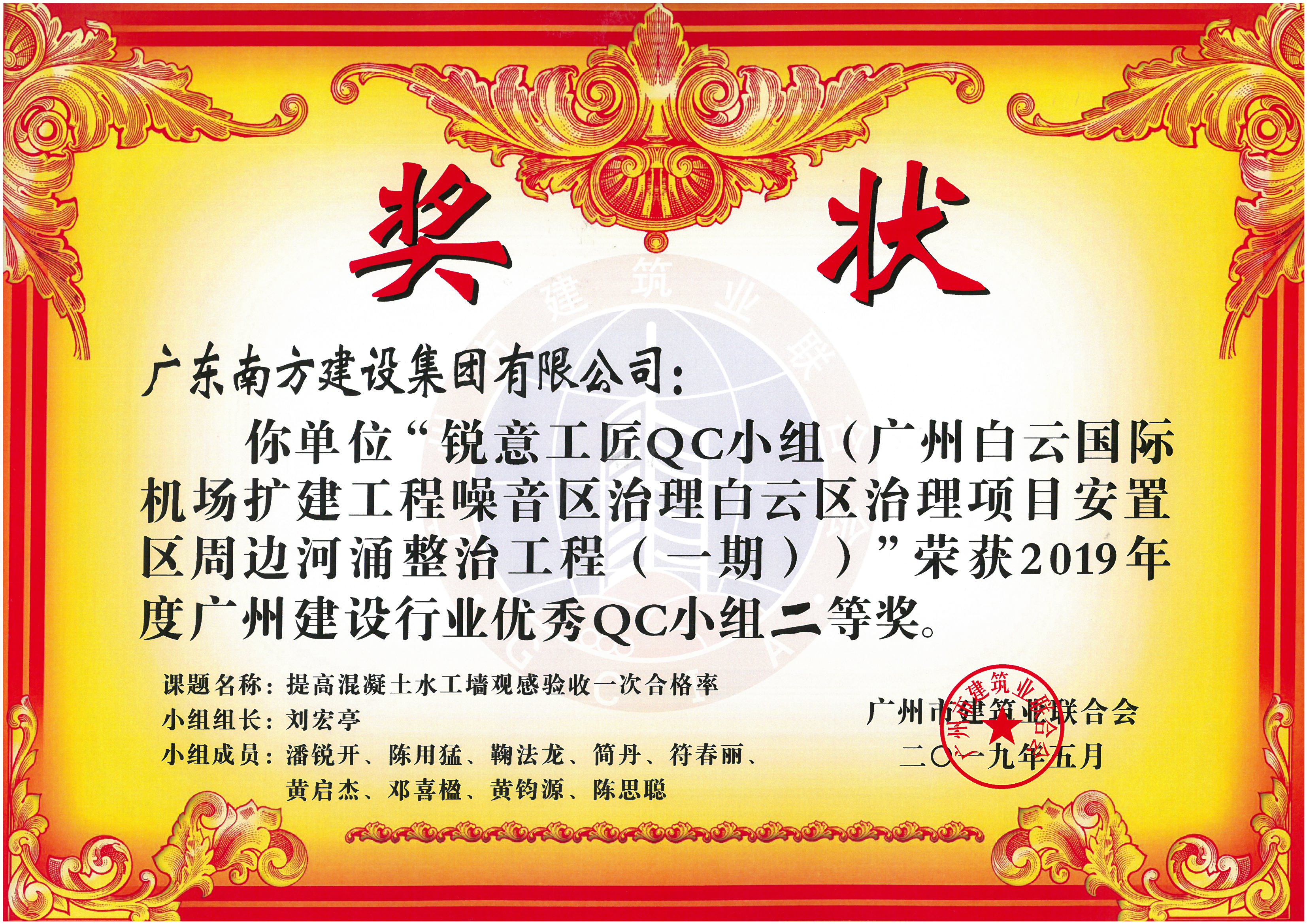 2019年度廣州建設(shè)行業(yè)優(yōu)秀QC小組二等獎(jiǎng)(廣州白云國(guó)際機(jī)場(chǎng)擴(kuò)建工程噪音區(qū)治理白云區(qū)治理項(xiàng)目安置區(qū)周邊河涌整治工程