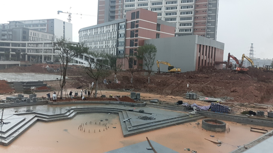 受今年第11號臺風(fēng)白鹿影響,8月 25~26日廣州市普降暴雨,陣風(fēng)達(dá)到6~7級。項(xiàng)目部管理人員在確保施工安全的情況下,帶領(lǐng)市政園林綠化工人們冒著風(fēng)雨,一邊壓實(shí)泥土、調(diào)整支架,防止種下不久的樹木被大風(fēng)刮倒,一邊繼續(xù)按進(jìn)度要求種植綠化樹木,爭取為即將入住的師生門展現(xiàn)一個美麗的白云學(xué)院新校區(qū)。