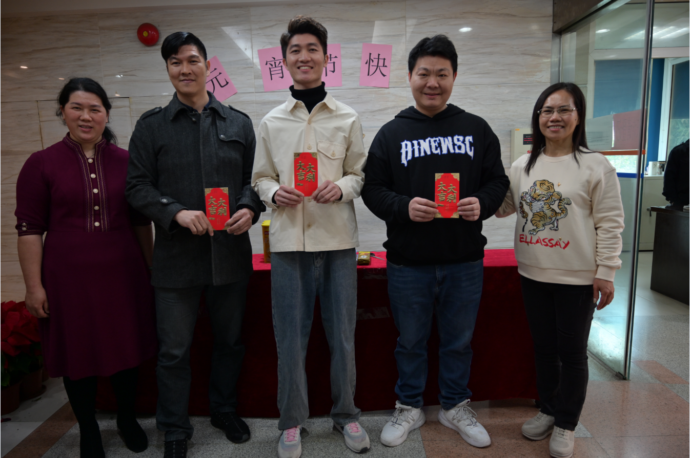 2022年元宵節(jié)上午10時,公司董事長潘啟開、副總經(jīng)理潘麗瓊高興的來到活動現(xiàn)場,對活動準備工作給予了肯定,董事長饒有興趣地抽取其中一個燈謎“春節(jié)元宵又傳捷”,謎底“節(jié)節(jié)勝利”好兆頭,在同事們的熱烈掌聲中,董事長為大家送上節(jié)日的美好祝福!