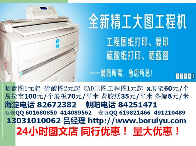 本公司是以標書裝訂、大圖復印、CAD出圖、工程圖復印、寫真噴繪、彩色輸出、加急快印名片、精裝、膠裝、數(shù)碼快印為主要業(yè)務的快印公司。彩色打印A4單面0.6元起黑白0.10元,名片10元起。